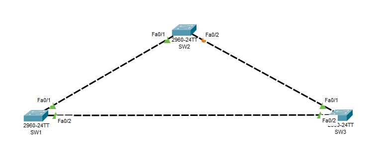 SW3 -> SW1 -> SW2 순서로 통신이 된다. 이 토폴로지는 왜  하필 SW2의 Fa0/2포트를 차단했을까?