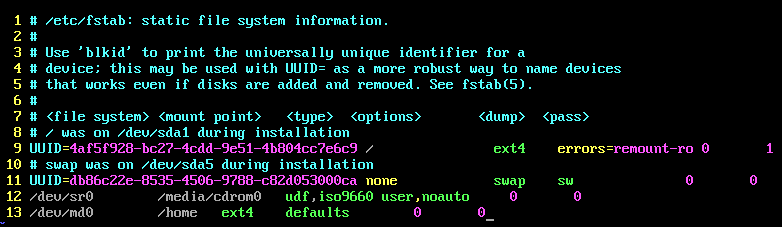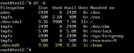 df -h 명령어로 /dev/md0이 /home에 마운트된것을 확인할수있다.