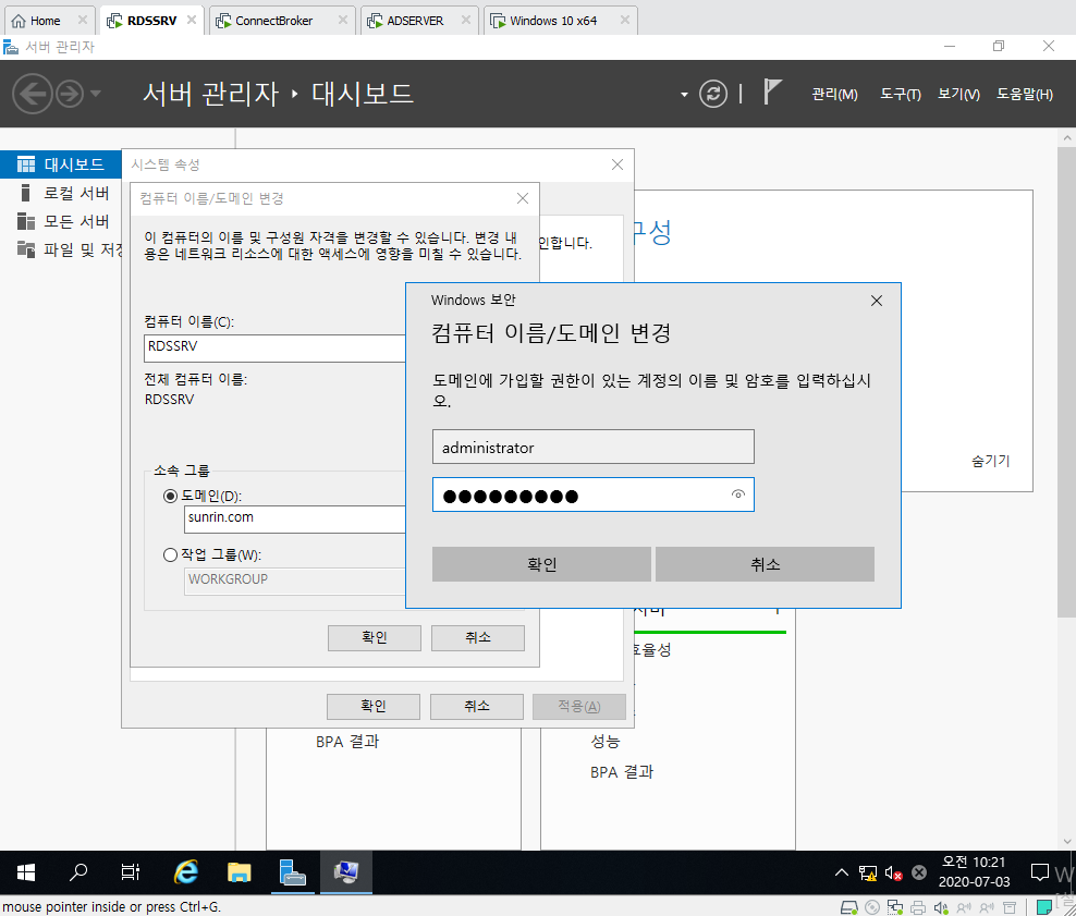 19. RDSSRV에서 AD 조인을 합니다. 위에 와 같이 권한이 있는 계정의 이름 및 암호 입력