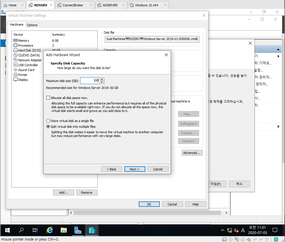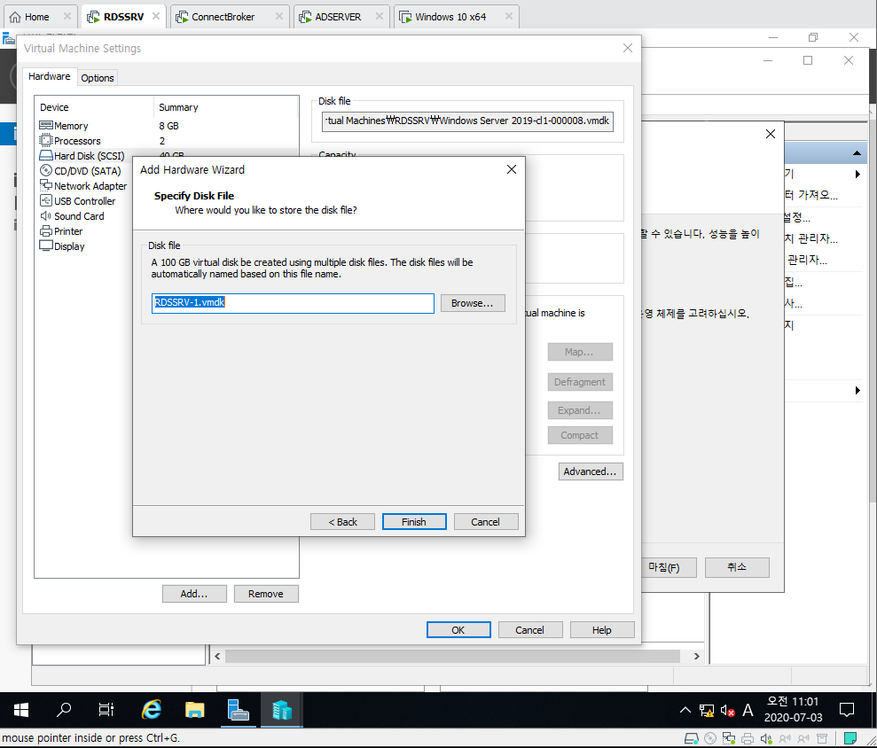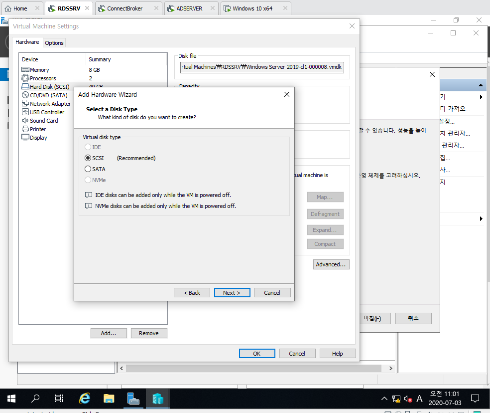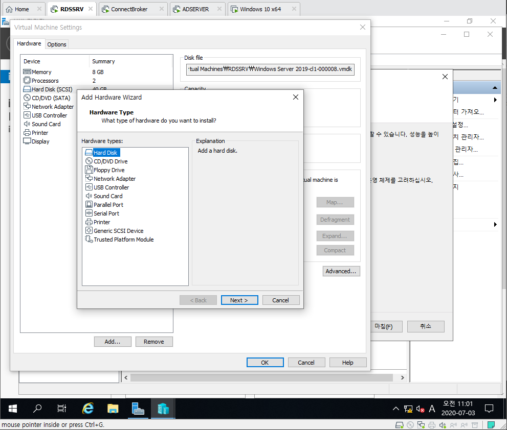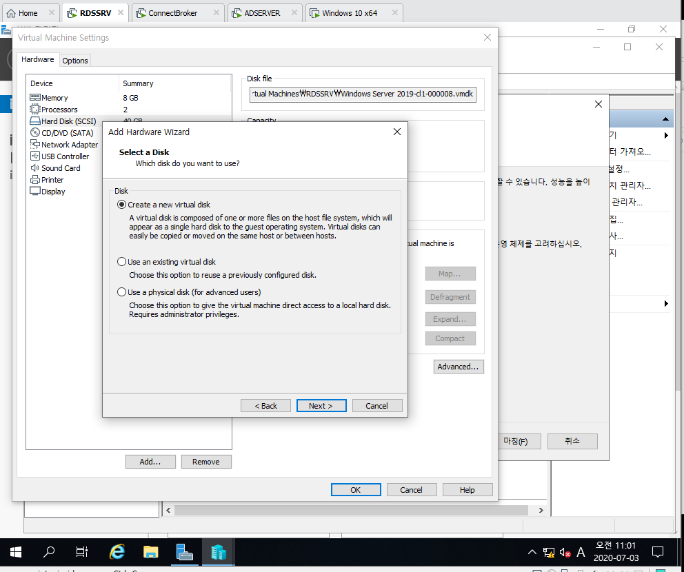 1. RDSSRV의 Virtual Machine Settings 들어간 후 Add Hard Disk 선택