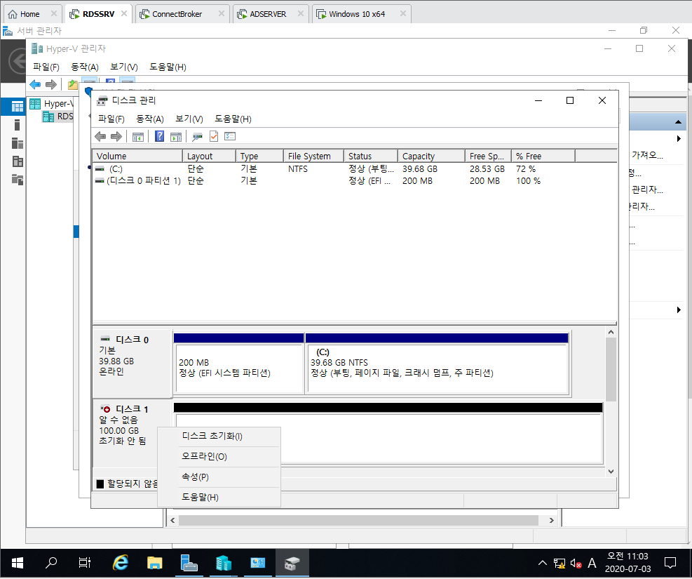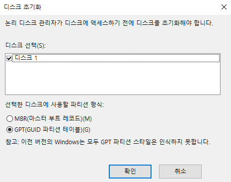 8. 디스크 1 선택 및 디스크 초기화 클릭