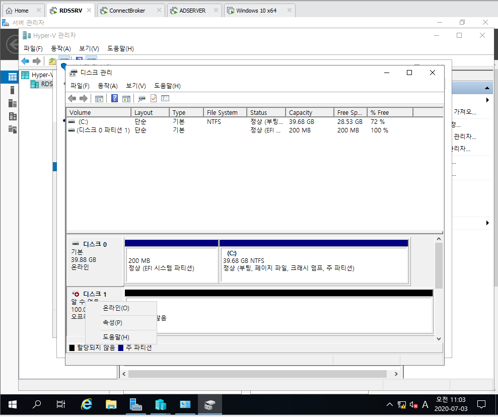 7. 디스크 1 선택 및 온라인 클릭