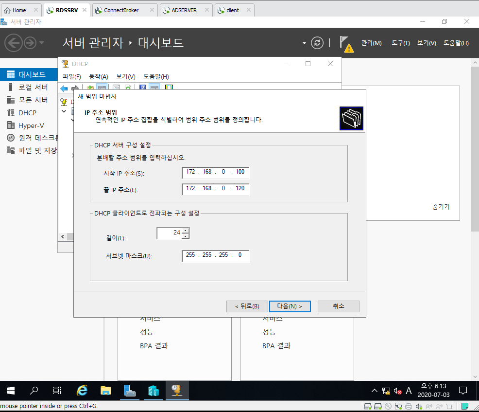 DHCP를 진행하는 이유는 가상컴퓨터에 IP를 넣어주기 위함입니다.