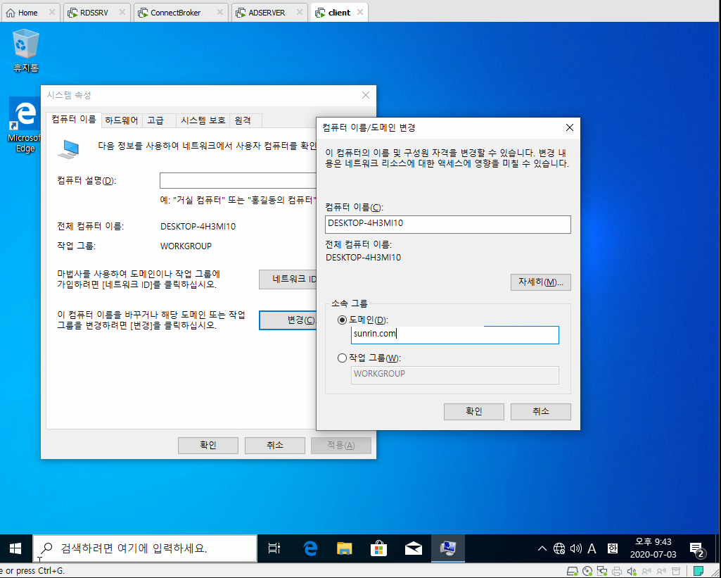 2.sysdm.cpl 를 치고 도메인을 sunrin.com 에 가입합니다.