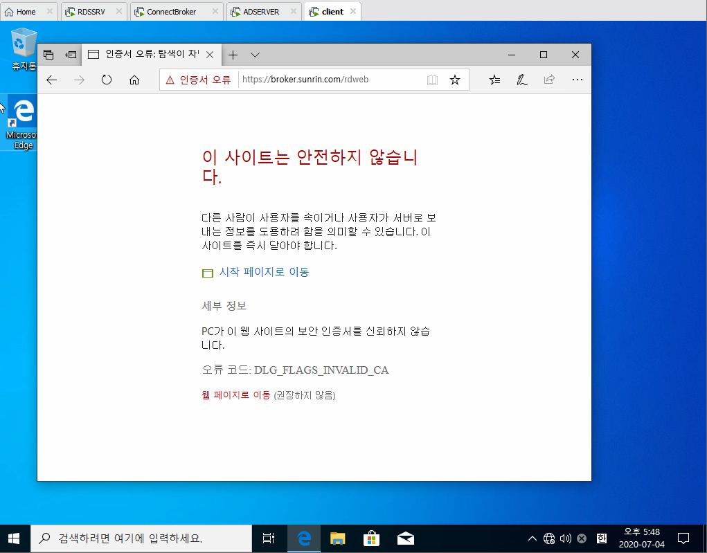 8. 웹 페이지로 이동 클릭합니다. (인증서가 없으므로 인증서 오류가 뜹니다.)
