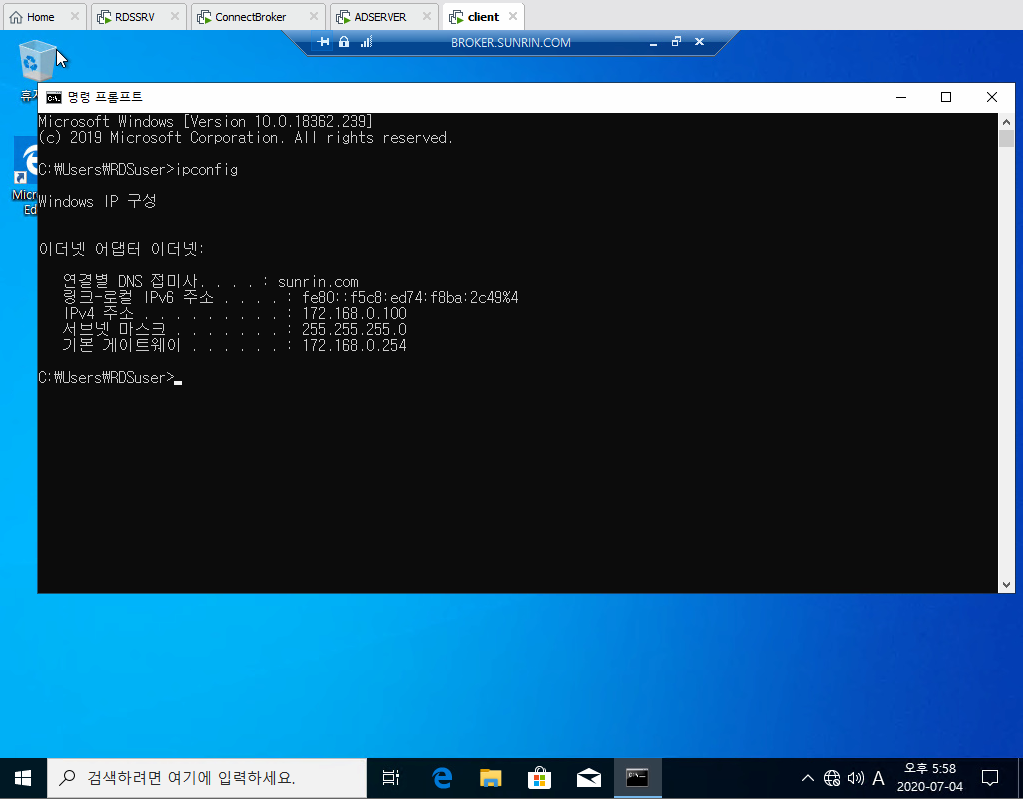 클라이언트를 만들면 자동으로 RDSSRV에 있는 DHCP에서 자동으로 아이피를 받아옵니다.