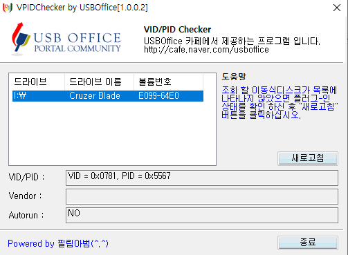 6. 이제 VPIDChk 안에 VPIDChk.exe 를 실행시켜 USB에 vid pid를 확인합니다.