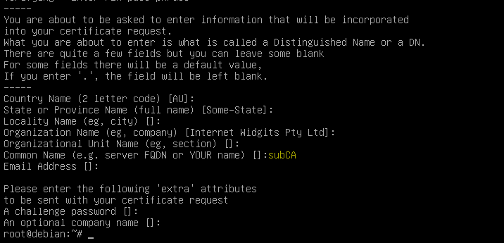 암호를 두번 입력하고 Common Name 에 subCA를 입력해줍니다.