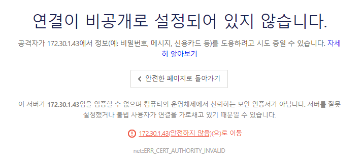 이런 창이 뜨면 안전하지 않음을 누르고 들어갑니다.
