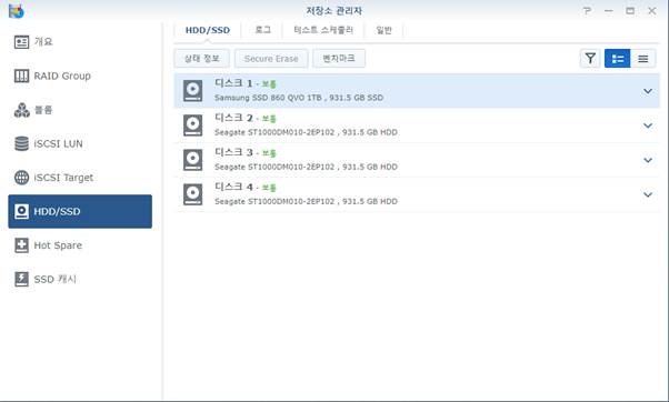 (자작 NAS (헤놀로지) 1TB HDD 4개로 Raid5를 진행하였고, 1TB SSD 캐시 구성)