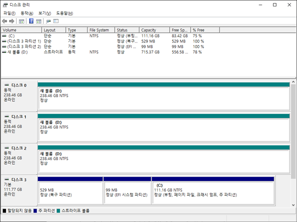 연결된 저장장치 상태 (스프라이프 볼륨을 이용하여 저장공간을 한 개로 합쳤다)