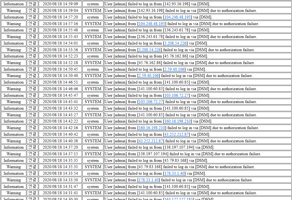 하지만 언젠가부터 헤놀로지에 admin 계정을 로그인 시도를 하였습니다.