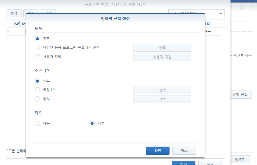 프로파일에서 대한민국 제외 차단을 선택해주고 규칙 편집을 눌러줍니다.