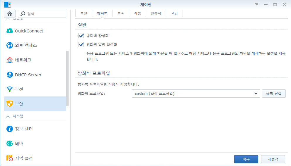 먼저 로그인을 하고 제어판-보안-방화벽에 들어갑니다.