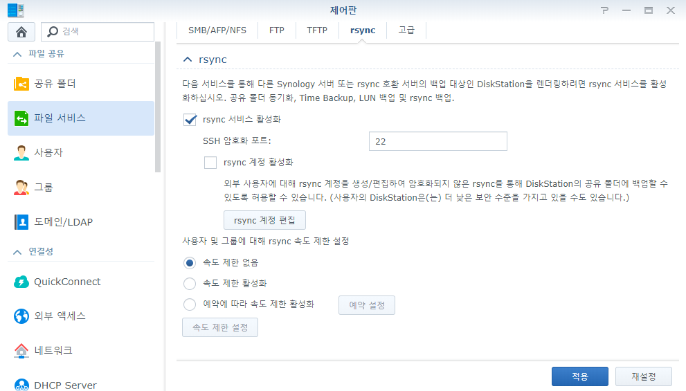 두 헤놀로지에서 제어판/파일서비스/rsync 활성화를 해줍니다.