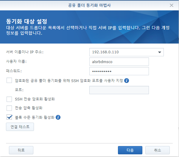 이제 동기화 대상의 정보를 입력하고 블록 수준 동기화 체크 후 연결 테스트를 합니다.