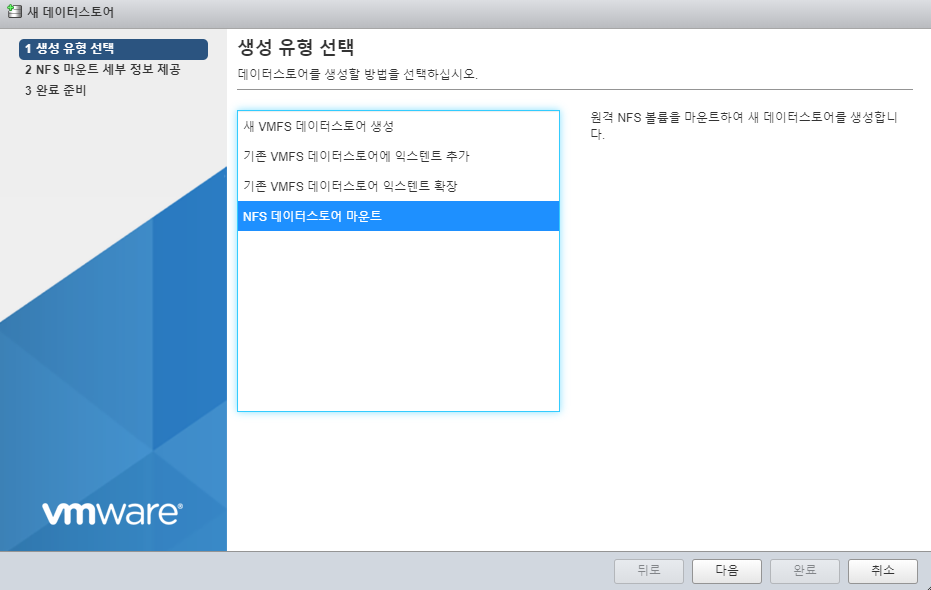 생성 유형은 NFS 데이터스토어 마운트를 선택합니다.