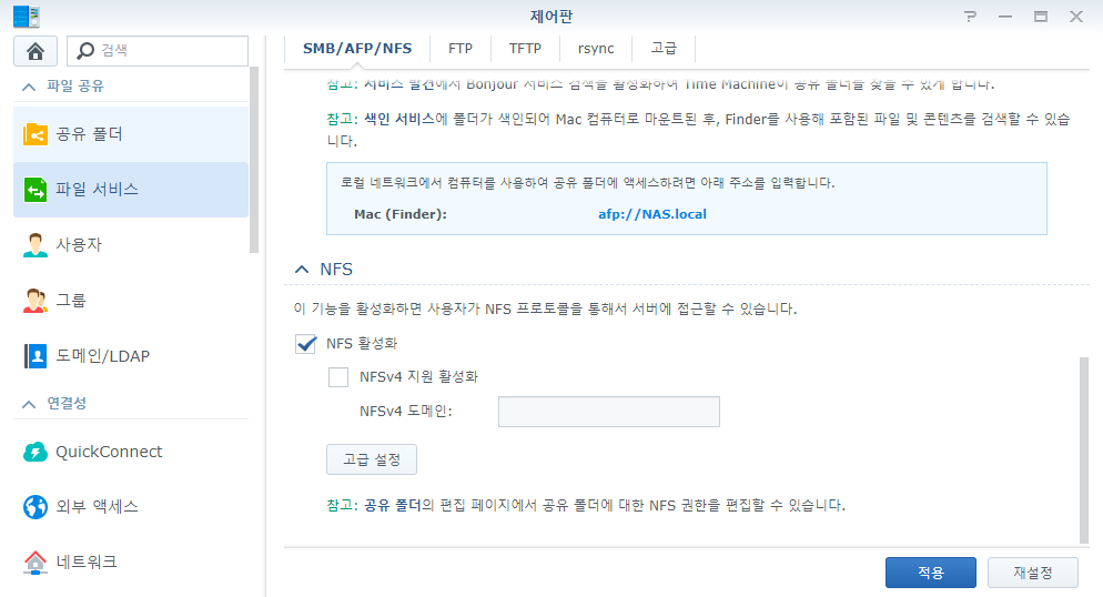 먼저 파일 제어판/파일서비스에 들어가서 NFS를 켜줍니다.