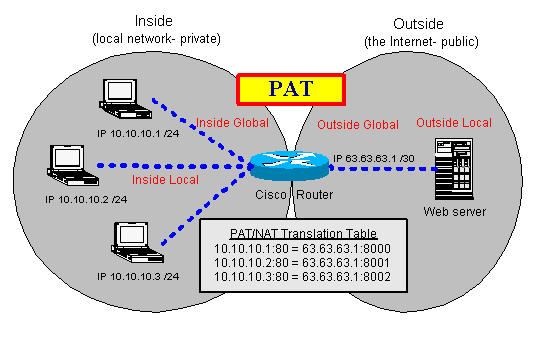 Dynamic NAT의 한 종류라고 볼 수 있는데, 공인 IP 주소 1개에 사설 IP 주소 여러개를 매핑하는 것이다. 변환된 IP 주소로는 사내망 호스트들을 구분할 수 없기 때문에 포트번호를 부여하여 구분한다. 대부분의 홈 네트워크는 PAT를 사용하고 있는데 ISP에서는 홈 네트워크 라우터에 하나의 공인 IP 주소를 할당한다.