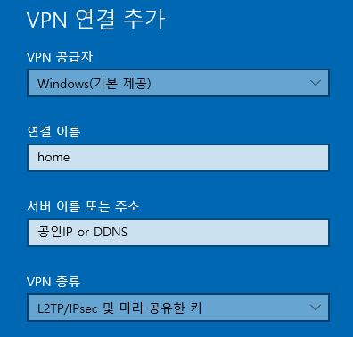 미리 공유한 키 : 설정한 암호 입력 (다른 VPN종류 사용시 설정이 달라집니다.)