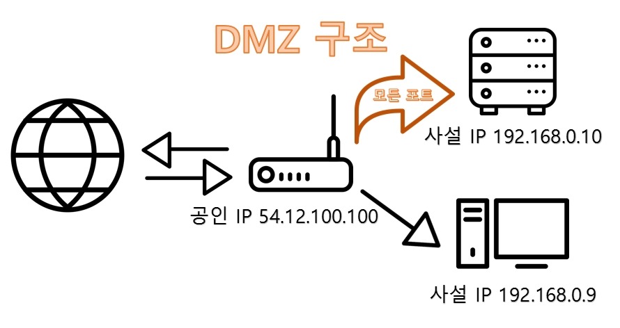 내부 IP 중 하나의 IP를 지정하여, 공유기에 사용하는 공인 IP의 모든 포트를 지정된 IP주소로 연결을 합니다.