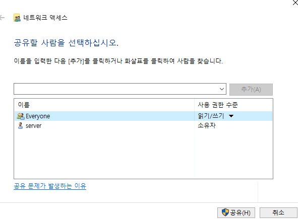 이렇게 Everyone을 선택 후에 사용권한을 꼭 읽기/쓰기를 주세요.