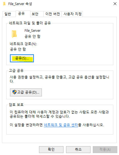 속성에서 공유탭에 들어가서 공유를 눌러주세요. 그러면 공유할 사람을 선택할 수 있는 창이 나옵니다.