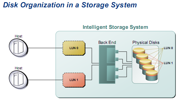 아래 그림은 여러 물리 디스크 즉 RAID를 한 다음에 파티션을 나눠 LUN0 LUN1이런식으로 사용되는 모습입니다.