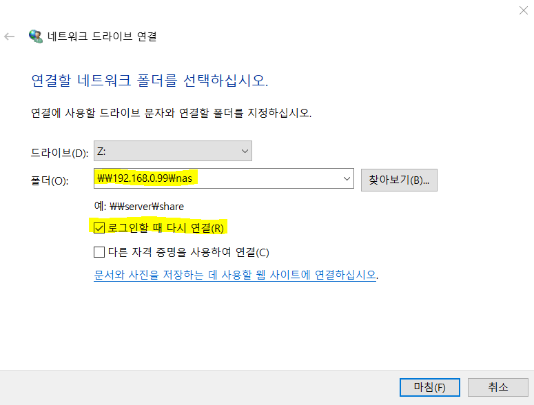 이렇게 설정창이 나오면 네트워크 폴더 위치를 적어줍니다.