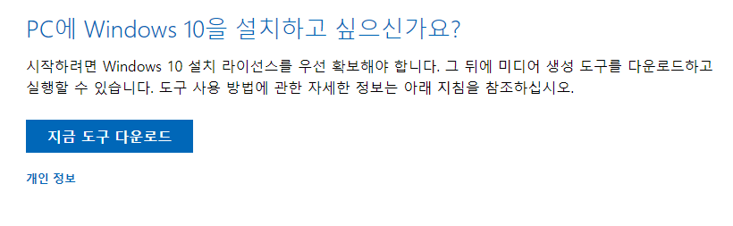 먼저 위에 마이크로소프트 홈페이지에 접속해서 지금 도구 다운로드로 파일 다운 후 실행해주세요.