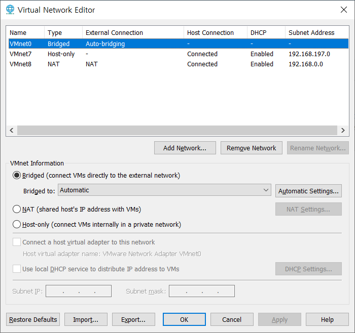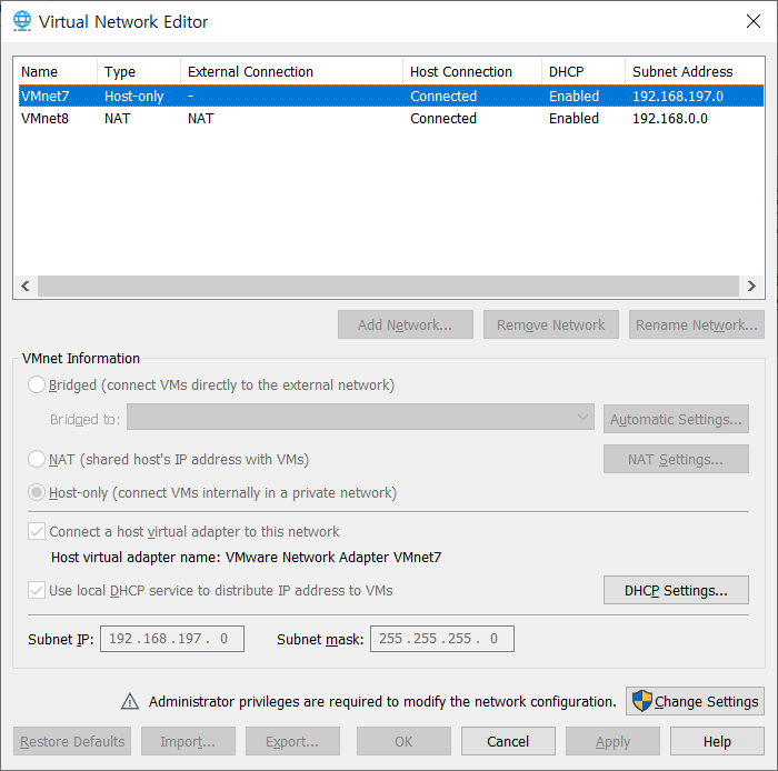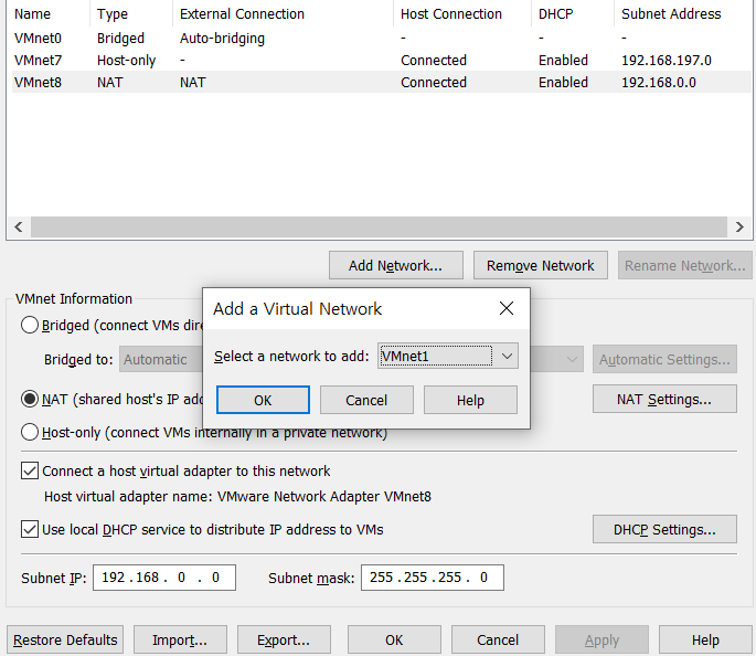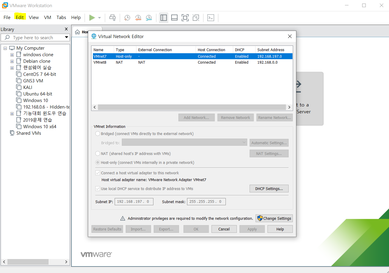저는 지금 VMnet0 은 브릿지로 7은 Host-only로 8은 NAT로 사용중에 있습니다.