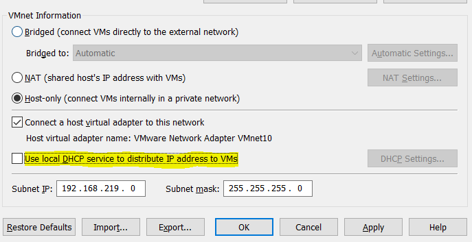 그럼 이렇게 기본으로 VMnet10이 생성되고 Host-only 모드로 된 것을 볼 수 있습니다.