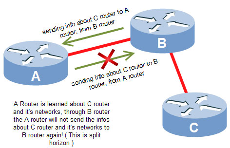 스플릿 호라이즌이란 거리 벡터 라우팅 프로토콜을 사용할 때 라우팅 루프를 방지하기 위해서 사용하는 기술로 임의의 한 인터페이스에서 학습한 경로를 동일한 인터페이스르 통해 전달하지 않게 하는 기술입니다.
