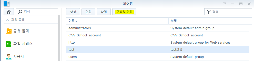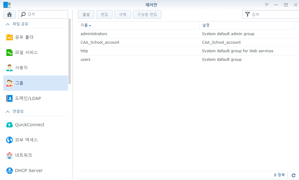 먼저 제어판 -> 그룹 으로 이동 후 상단의 생성 버튼을 눌러줍니다.