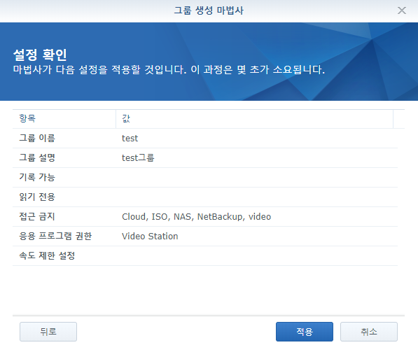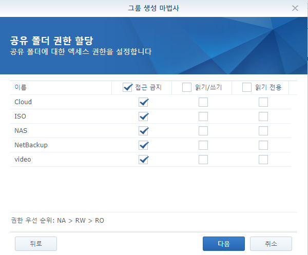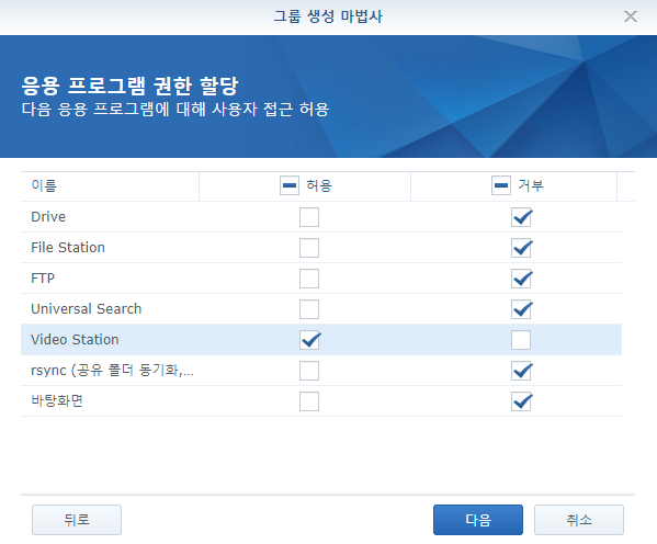 저는 Video Station만 권한을 줄 예정이기 때문에 다 접근 금지시켰습니다.