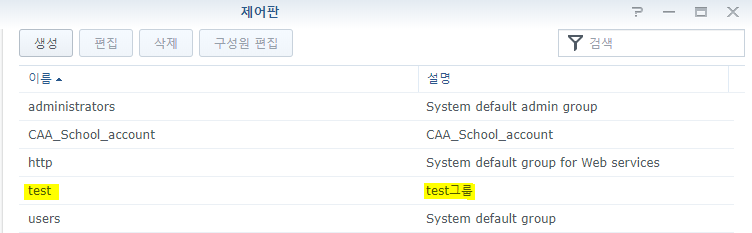 먼저 제어판 -> 그룹 으로 이동 후 상단의 생성 버튼을 눌러줍니다.