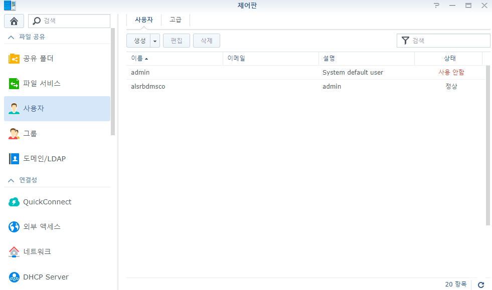 그래서 시놀로지에서는 편하게 유저 생성 할 수 있는 방법이 있습니다.