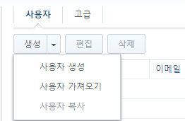 그럼 이렇게 사용자가 나옵니다. 이제 생성 우측에 작은 역삼각형은 눌러봅시다.