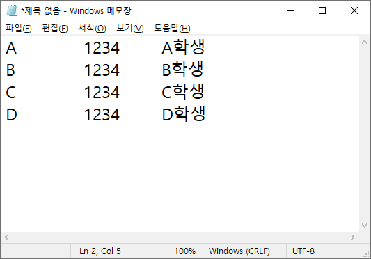 저는 이렇게 적었습니다. 위에서도 말했지만 저 빈칸은 TAB키로 구분해주셔야 합니다.