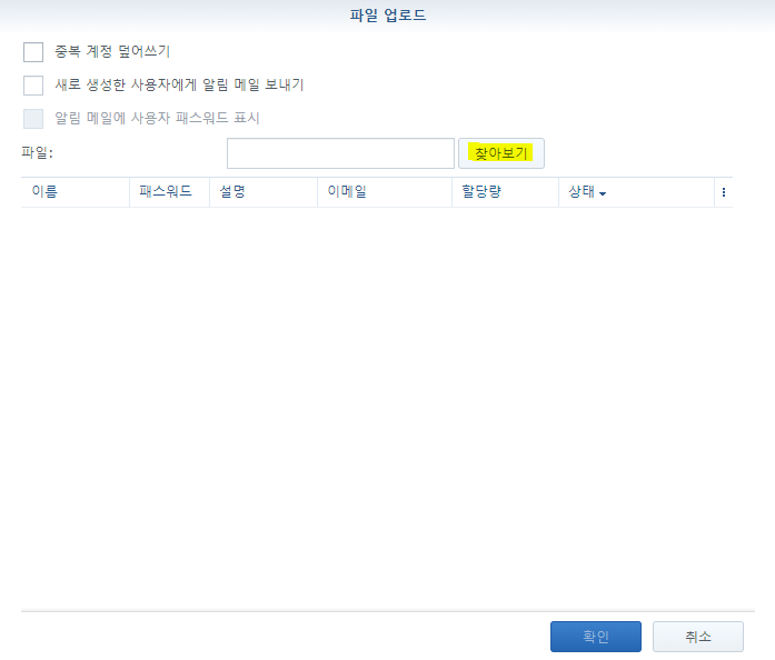 시놀로지에 데이터를 넣기 위해서는 아이디/비밀번호/설명(소속명)/등등