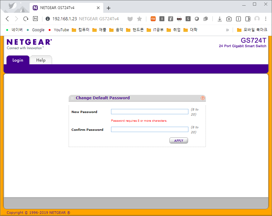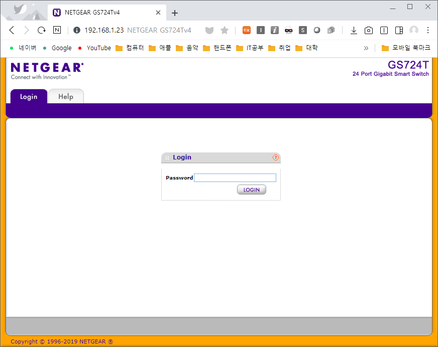이제 웹브라우저를 이용해서 주소창에 위 아이피를 입력하면 관리자모드에 접속이 가능합니다. GS724T의 경우 기본 설정된 비밀번호는 "password"입니다. "password"라고 입력 후 로그인 버튼을 눌러주세요.