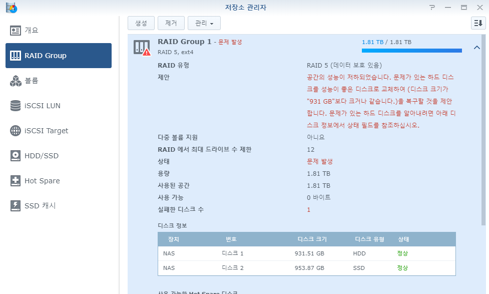 RAID5이기 때문에 3개 중 한 개가 망가지더라도 작동이 가능합니다.