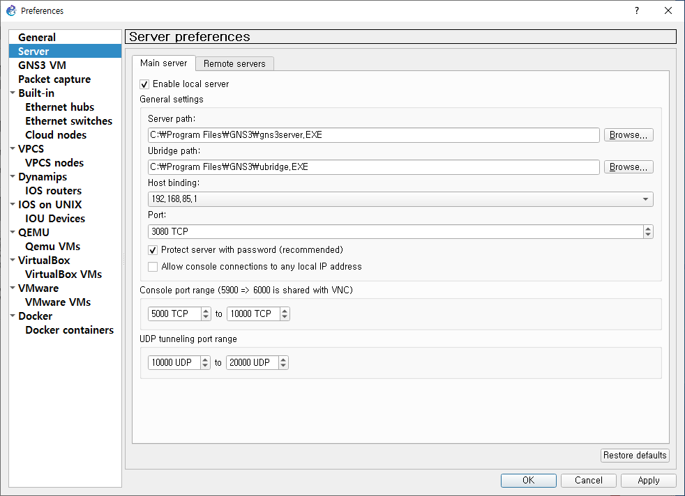 Host binding에 위에 GNS3 VM화면에 나온 아이피와 같은 대역을 선택해주고 Apply를 눌러줍니다.