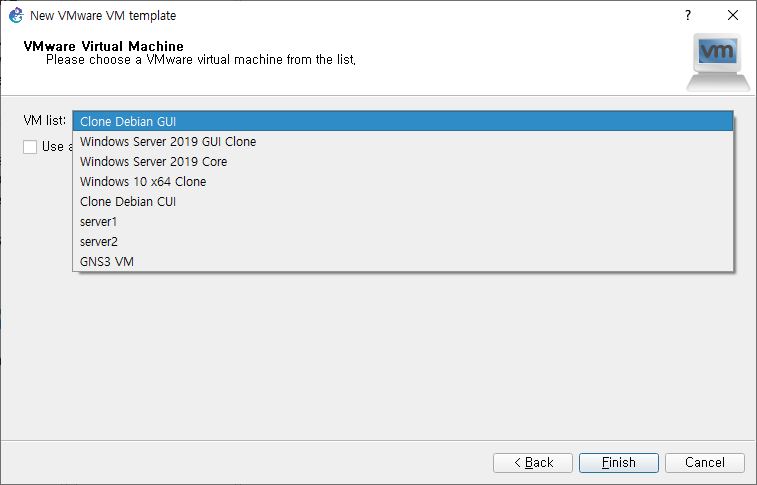 List에서 사용하고 싶은 가상머신을 선택하고 Finish를 눌러줍니다.
