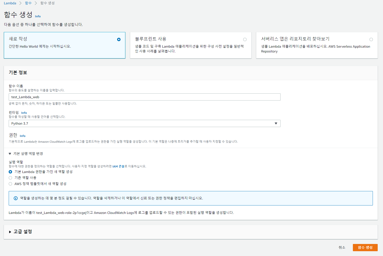 위처럼 진행했다면 오른쪽 하단에 함수 생성을 눌러주세요.