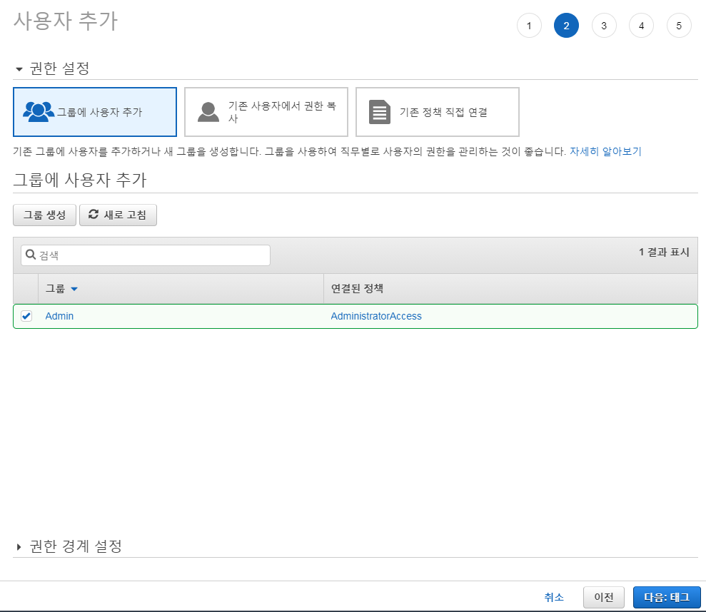 그룹 이름을 만들고 ‘AdministratorAccess’를 체크합니다.