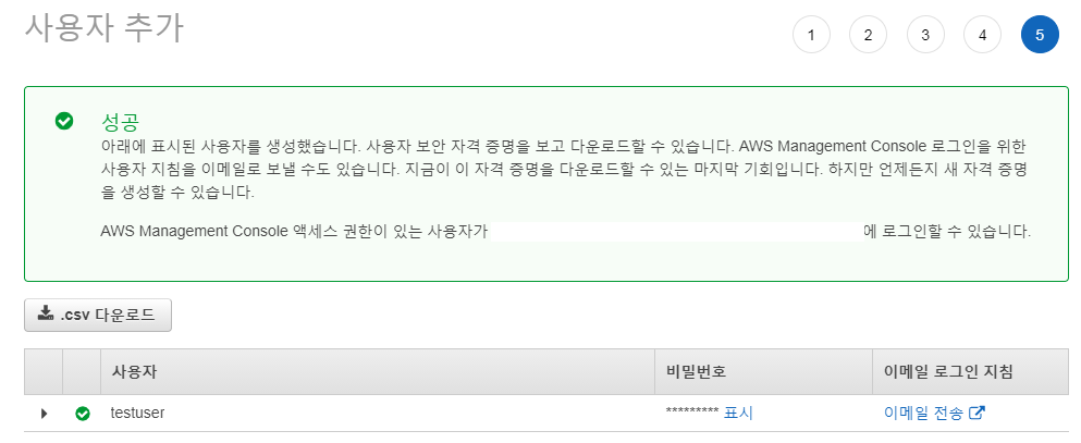 csv 파일 안에는 패스워드와 콘솔 로그인 링크가 있으므로 조심히 보관합니다.