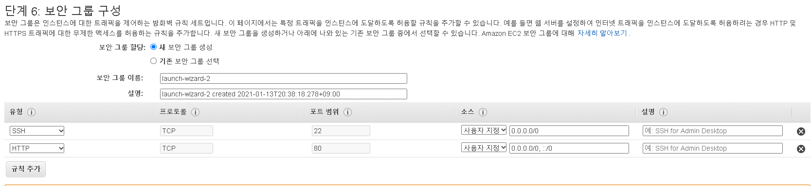 보안 구성은 다시 해야 하니 HTTP 및 SSH 포트를 열어주세요.