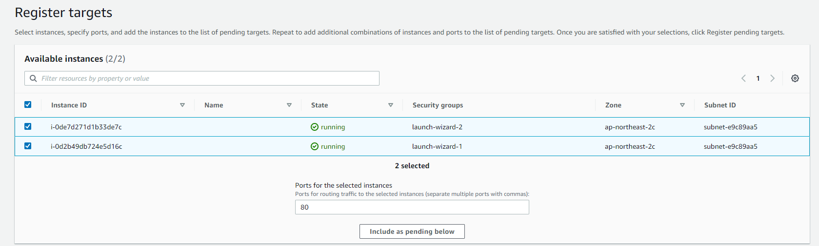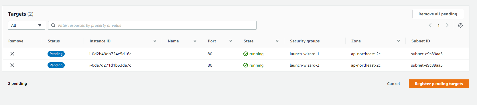 그럼 바로 하단에 이렇게 인스턴스 2개가 들어오고 Register pending targets 버튼을 눌러주세요.
