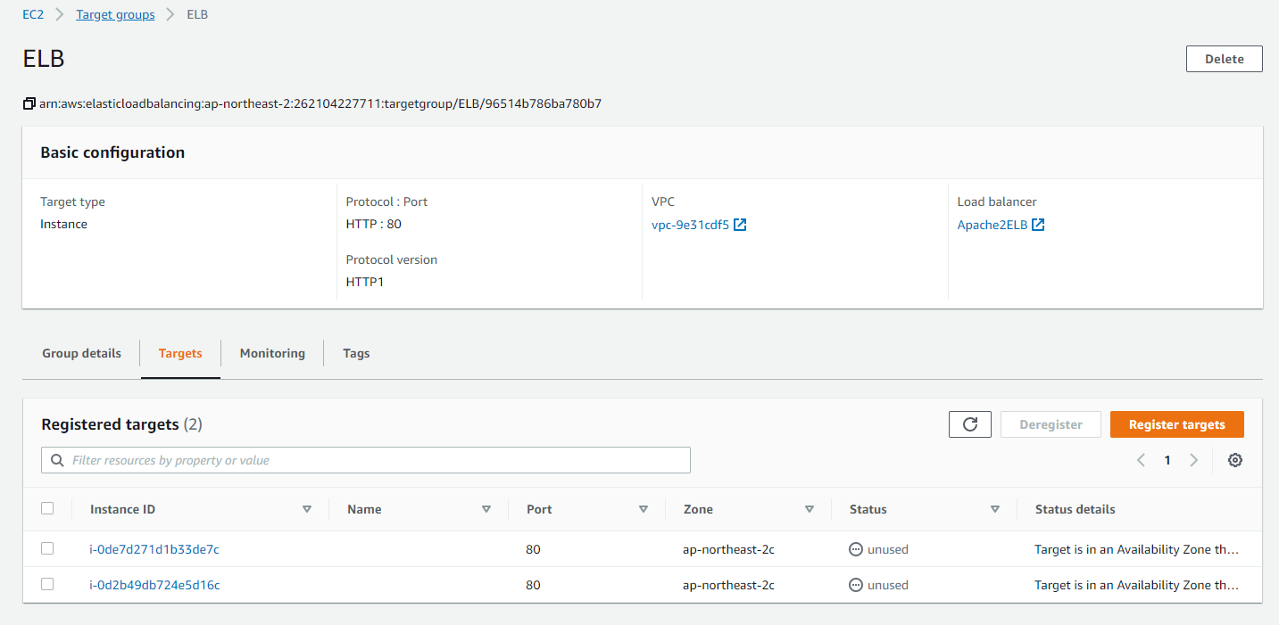 이제 인스턴스를 등록해줘야합니다. Register targets을 눌러줍니다.